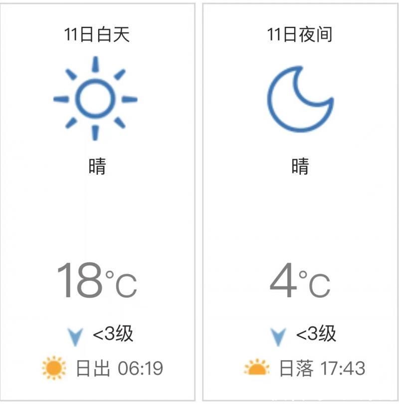 今天白天晴,北转南风二三级,最高气温18℃;夜间晴,南转北风一二级,最低气温5℃。今明两天以晴为主,利于出行和户外活动。昼夜温差大,早晚气温低,早出晚归注意添衣防寒。